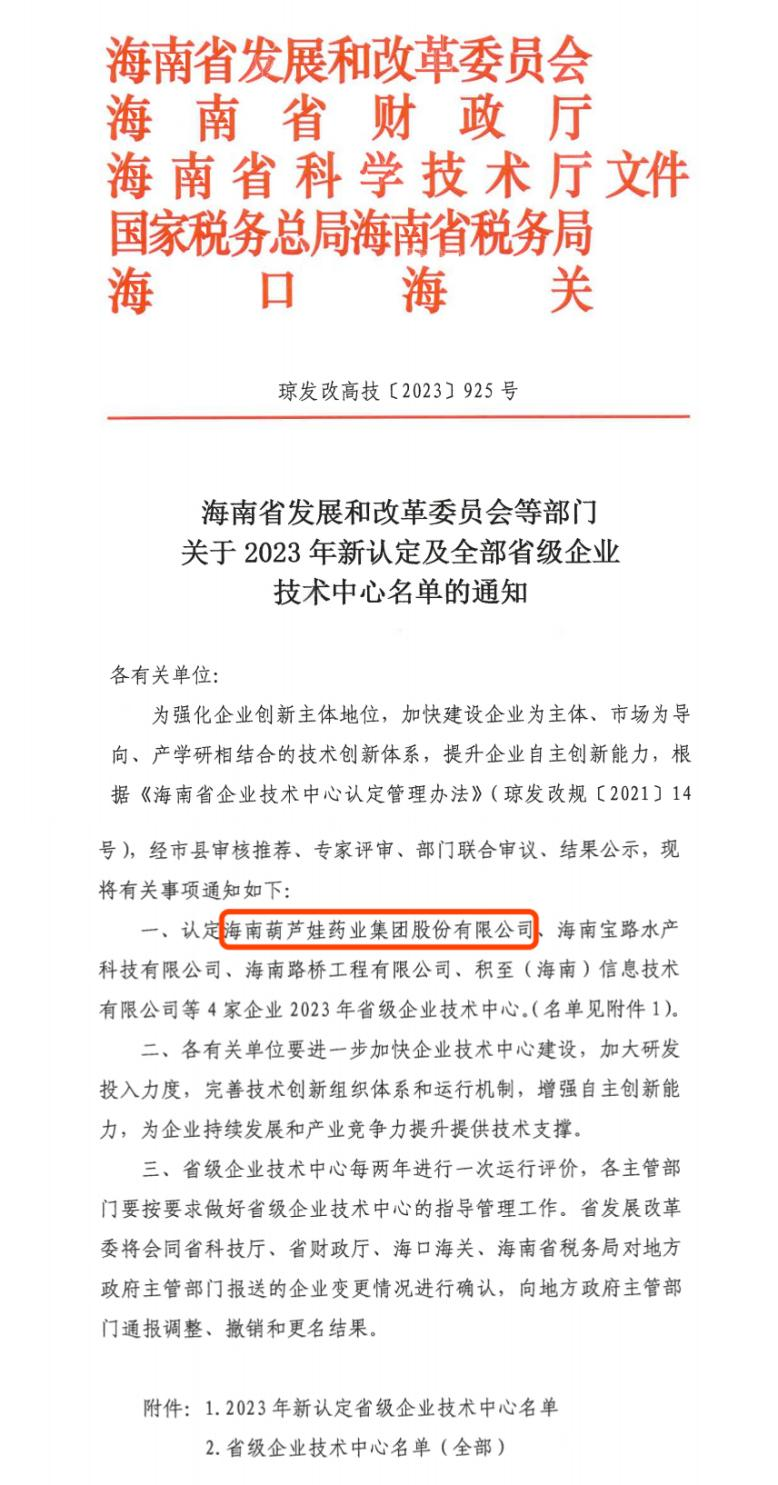 近日,海南省发改委等多部门联合公布了《关于2023年新认定及全部省级企业技术中心名单的通知》,其中,海南z6尊龙药业集团股份有限公司成功通过评审,被认定为省级企业技术中心,是本次获批的4家企业之一。